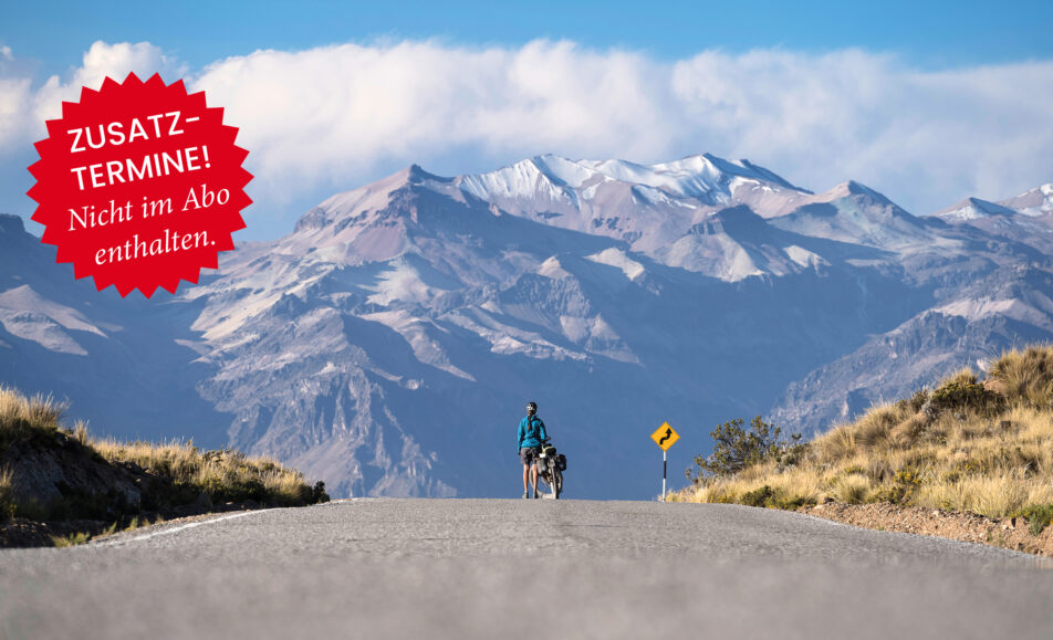 Wiederholung wegen großer Nachfrage, nicht im Abo enthalten! Begleite Anita und Andreas auf einer emotionalen, intensiven Fahrrad-Reise durch das Reich des Kondors. Beginn 19:30h!